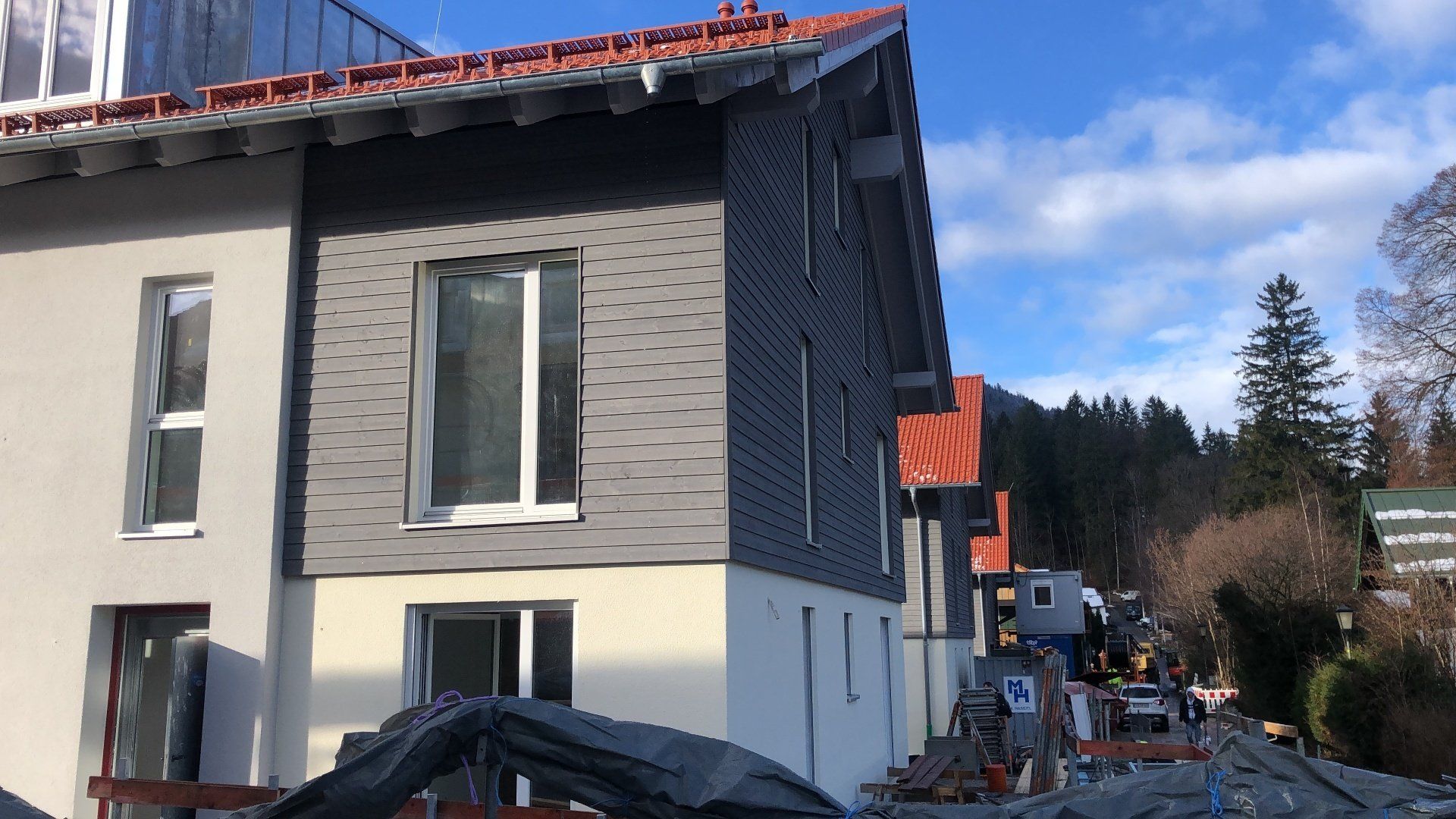 An 4 Mehrfamilienhäusern sind die Fassaden zu verkleiden. Es wird eine Unterkonstruktion an der Fassade angebracht, und anschließend mit vorgefertigten Fichtenbrettern verkleidet. Das Projekt befindet sich in Oberammergau, die Arbeiten ziehen sich über mehrere Monate.
