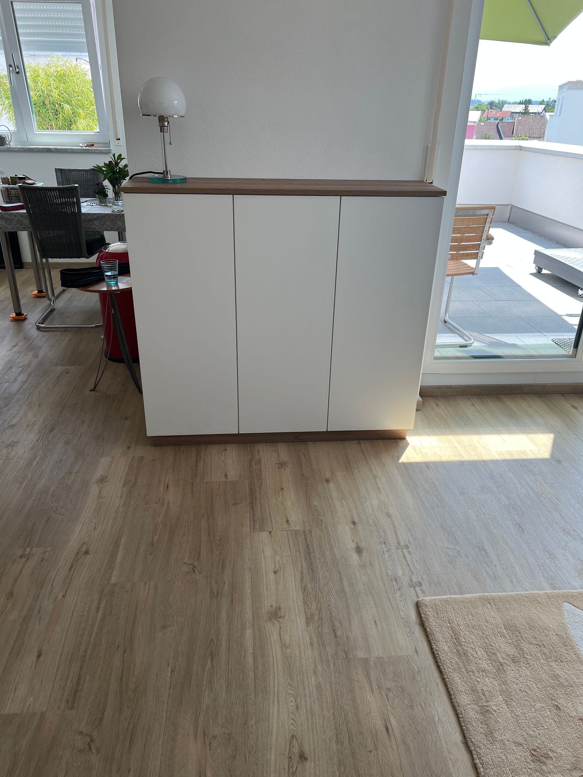 Die Garderobe hängt ohne sichtbare Befestigung frei tragend an der Wand.